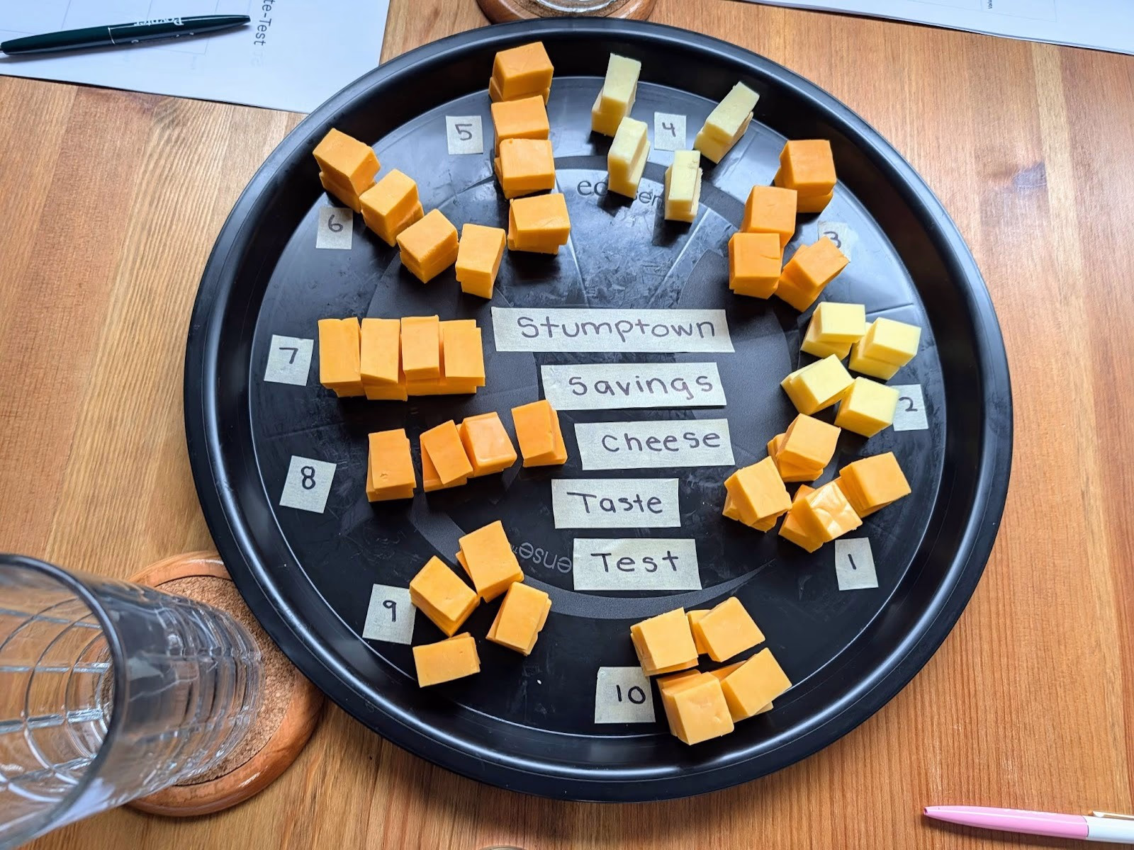 The week of the event, I ventured out across the Portland metro area to acquire the cheeses. We focused on medium cheddars, opting for mild if the store’s medium option was out of stock. The afternoon of the test, my wife, Monique (who is also the Stumptown Savings editor!) sliced the cheeses and anonymized them, mixing Tillamook’s medium cheddar randomly into the mix.